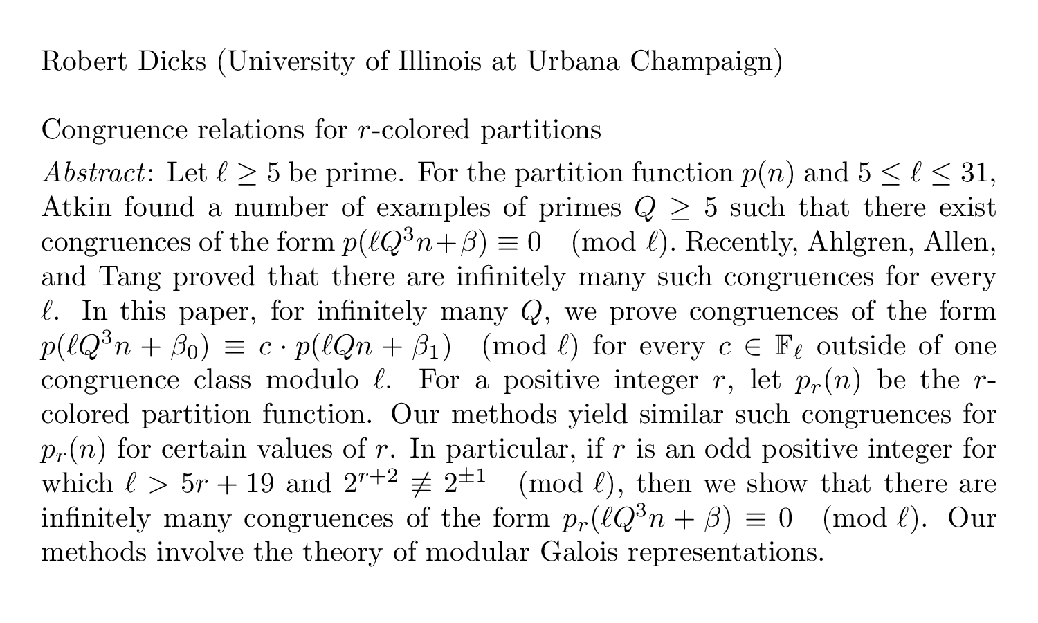 10:30 - 10:50: Robert Dicks, "Congruence relations for r-colored partitions"