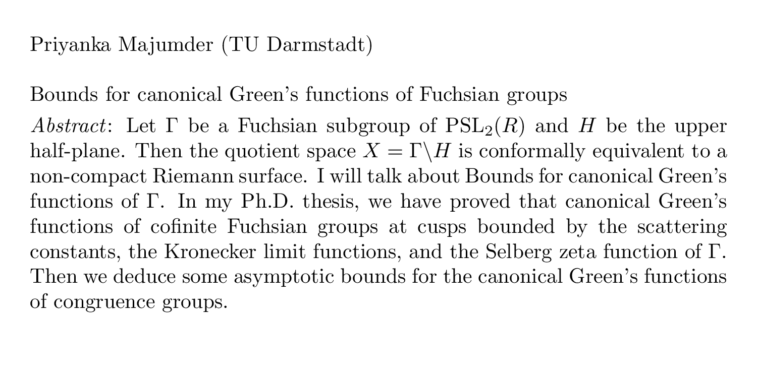 9:40 - 10:00: Priyanka Majumder, "Bounds for canonical Green's functions of Fuchsian groups"